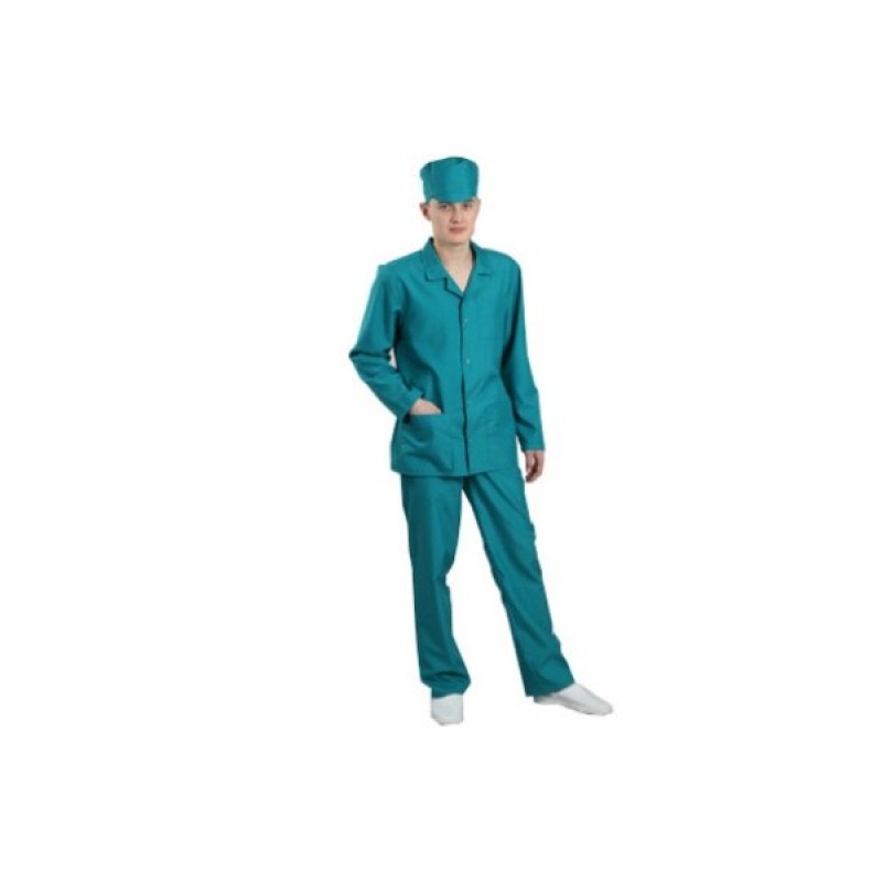 Куртка прямого силуэта с центральной бортовой застежкой на пуговицы. Рукава длинные, прямые, втачные, одношовные с цельнокроеными манжетами, застёгивающимися на кнопки (2 положения фиксации). Воротник – отложной с лацканами. С изнаночной стороны под воротником вшита вешалка. Спереди находятся два нижних накладных кармана и один нагрудный накладной карман. В левый нижний карман вшит знак EPA. Спинка с кокеткой, из-под которой заложены складки. Сзади по линии талии – хлястик с застежкой на кнопки. Брюки характеризуются прямым силуэтом, по поясу стянуты эластичной тесьмой и шнуром. В правый боковой шов вшит знак EPA. Модельные особенности призваны способствовать выполнению требований к промышленной чистоте.