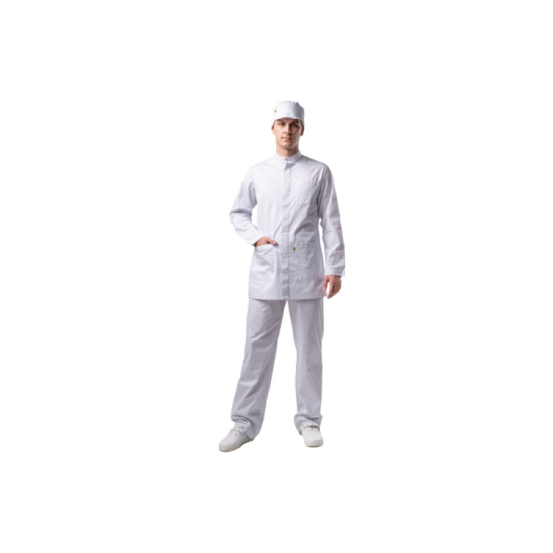 Костюм антистатический мужской М-454К состоит из куртки и брюк. Куртка прямого силуэта с центральной супатной (потайной) бортовой застёжкой на кнопки, воротник – стойка с застёжкой на кнопку. Перед куртки цельнокроеный с двумя нижними накладными карманами и одним нагрудным накладным карманом, на котором отстрочено отделение под ручку. В левый нижний карман вшит знак EPA. Спинка с кокеткой, под которой заложены две складки. По линии талии расположен хлястик с застёжкой на кнопки. Рукава длинные, втачные, одношовные с цельнокроеными манжетами на кнопках (два положения фиксации).